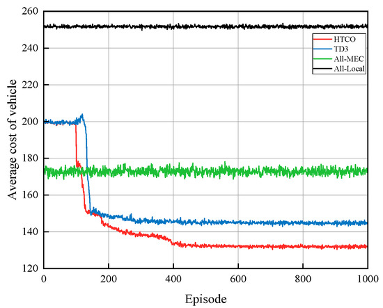 Figure 9 shows the average cost of the vehicles for the four offloading schemes for different task data volumes. From the experimental results, it is clear that an increase in the amount of computational task data affects the average cost of the vehicle by affecting the processing time and transmission time of the task, and, thus, the average cost of the vehicle. Tasks must be transmitted to the MEC server for execution via wireless communication, which increases the time cost of transmission. As the number of computational tasks increases, HTCO can achieve better performance than TD3, All-Local, and All-MEC due to HTCO’s ability to allocate bandwidth resources and normalize input states. When the task data size is 70M, HTCO achieves better performance than TD3, All-Local, and All-MEC by approximately 9.1%, 31%, and 103%, respectively.