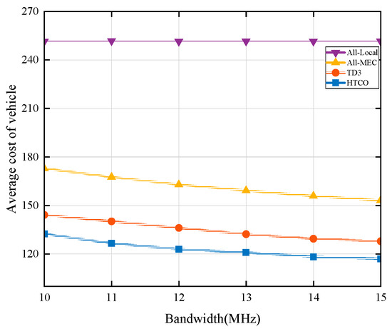 Figure 6 shows the effect on the average vehicle cost when the number of vehicle users is five and the bandwidth size varies from 10 MHz to 15 MHz. From the figure, it can be seen that as the wireless bandwidth resource increases, the average vehicle cost decreases for the HTCO, TD3, and All-MEC schemes, while the average vehicle cost remains stable for the All-Local scheme. This is because as the bandwidth increases, the transmission rate of the vehicle task also increases, resulting in a decrease in transmission delay. The average cost of the All-Local scheme remains unchanged because it only uses the computational resources within the vehicle to process the tasks. Compared to the TD3 scheme, the HTCO algorithm proposed in this paper has a lower system cost for different system bandwidths because the HTCO algorithm optimally allocates the bandwidth resources in advance according to the task size, which reduces the transmission delay of the tasks. At a total bandwidth of 15 MHz, the average cost of the HTCO strategy is reduced by about 9%, 22%, and 54% compared to TD3, All-MEC, and All-Local, respectively. These results show that the scheme proposed in this paper performs well in reducing the system overhead.