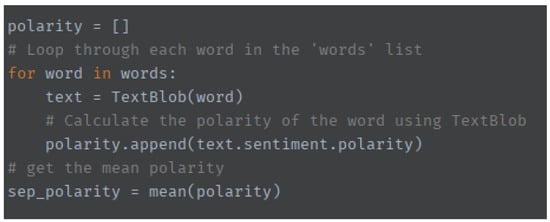 Figure 1. Code to find the average polarity of tweets. - Tweet Categorization: With the average polarity score as a threshold, we disregarded the sentiment labels and categorized the tweets (code shown in Figure 2) as follows: