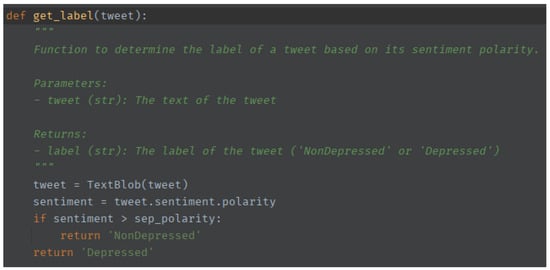 Figure 2. Code to compute the depressive label of each tweet.- Non-Depressive Tweets: Tweets with a polarity score higher than the threshold were re-labeled as non-depressive tweets. Some of these tweets may have been considered indicative of a negative sentiment but not necessarily reflective of depression.