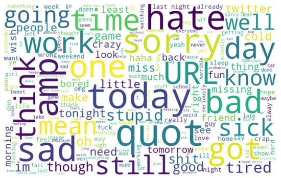 By employing this custom algorithm, we repurposed the Sentiment140 dataset for depression detection; the system can extract valuable insights regarding the users’ mental well-being [,]. Specifically, the system will focus on identifying negative expressions or comments, which have been shown to correlate with depressive symptoms [,].