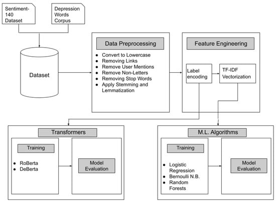 In this study, we conducted a comparative analysis of various natural language processing models using the framework shown in Figure 5 to evaluate their effectiveness in accurately classifying depression in Twitter posts. We compared the outcomes generated by these models and assessed their classification accuracy. The Sentiment140 dataset is used in conjunction with a corpus of words correlated to depression to generate the depression dataset, and then the dataset undergoes further preprocessing like lemmatization, stop word removal, and so on. After that, some feature engineering is completed to make the data available for use by the ML algorithms. For the transformer models (RoBERTa, DistilBERT, DeBERTA, and SqueezeBERT), label encoding is the only feature engineering performed on the data before training and evaluation. The traditional ML algorithms (logistic regression, Naive Bayes, and random forests) have to undergo both label encoding and vectorization before training and evaluation.