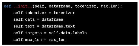 - Data Loading: The __init__ method in Figure 6 initializes the class by storing the tokenizer, dataframe, text data, labels (targets), and maximum sequence length.