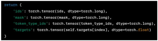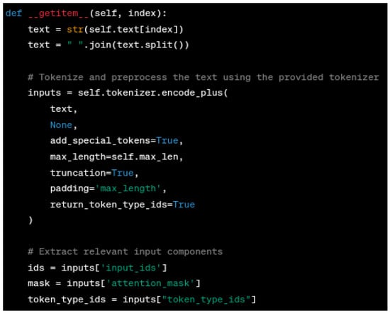Figure 8. Code for data retrieval. - __getitem__ return: The __getitem__ method shown in Figure 9 returns a dictionary containing the following elements for each data sample. This dictionary allows for easy access to the processed data when training deep learning models. For example, you can retrieve the input IDs using sample[‘ids’] or the target labels using sample[‘targets’], where sample is an instance of the dataset generated by the TextData class.