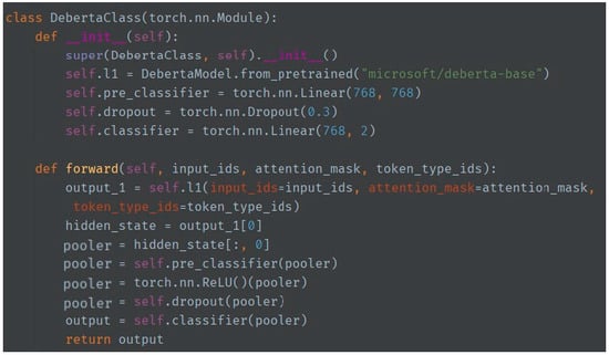 Figure 10. Model architecture used for fine tuning of the DeBERTa model. - DistilBERT is a transformer-based language model that has gained significant attention in natural language processing tasks []. In our study, we fine tuned the DistilBERT model with the model architecture shown in Figure 11 as part of our methodology for detecting depression through social media. DistilBERT, a distilled version of the BERT model, offers a more compact architecture while retaining its powerful language representation capabilities.