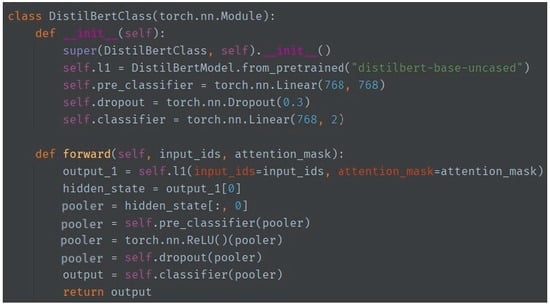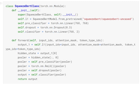 Figure 11. Model architechture used for fine tuning of DistilBERT model. - SqueezeBERT is another state-of-the-art pre-trained language model specifically designed for efficient computation on resource-constrained devices []. It employs a compact architecture that significantly reduces the model size while preserving the model’s performance. It was fine tuned for this study using the model architecture shown in Figure 12.