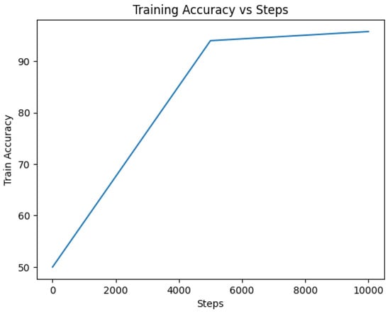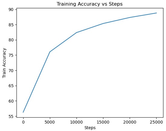 Figure 14. DsitilBERT accuracy curve.Throughout the training process, the accuracy curve steadily increased, indicating the model’s ability to capture patterns and make more precise predictions. Simultaneously, the loss curve consistently decreased, indicating that the model successfully minimized errors and improved its overall performance. The confusion matrix is shown in Table 3 below.