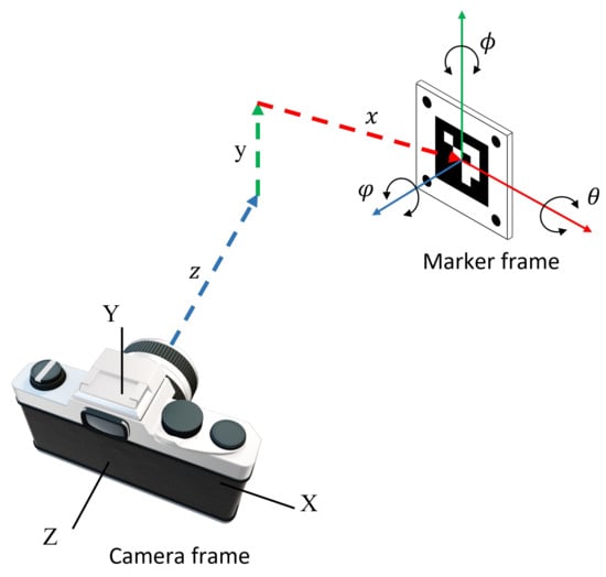 Among visual markers, AR markers have the advantage of easily enabling augmented reality and providing information to users in a more intuitive manner. Most AR markers use the principle of projective transformation to estimate the position and posture of the marker by finding a homogeneous transformation matrix that represents the position and posture of the marker’s coordinate system as seen from the camera coordinate system. The open source library ARToolKit markers [11] is a typical example, and this marker technology is used in self-position estimation [12,13,14,15,16,17] and mapping [18,19,20] for mobile robots, and is an essential technology in navigation systems.