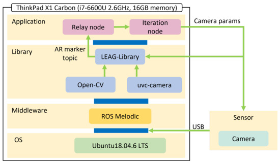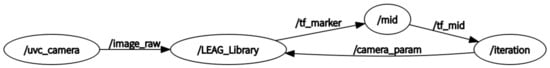 Figure 4 shows the software configuration of the camera control system proposed in this paper. ROS Melodic was used as the middleware for the development of this study. The software used for AR marker recognition was LEAG-Library from LEAG Solutions Corp. This library is compatible with the high-accuracy recognition method of Tanaka et al. [37]. It also uses OpenCV as an image processing library and uvc-camera as a library for acquiring images from USB cameras. The Relay node relays the AR marker values received from the LEAG Library. It identifies marker IDs and performs type conversion. The Iteration node determines camera parameters such as zoom, focus, and calibration data based on the AR marker values received from the Relay node and provides input to the camera and feedback to the LEAG-Library. It also determines the convergence of the AR marker position and posture and the final AR marker value. Topic communication was used to send and receive AR marker information between nodes. Figure 5 shows the correlation diagram of topic communication between nodes obtained from the ROS function rqt_graph. The mid node acts as the Relay node shown in Figure 4, passing AR marker values to the iteration node using a topic named tf_mid. Each node is written in C/C++ language for high-speed processing. The cycle of topics delivered from the LEAG Library is approximately 30 Hz, which is the same as the frame rate of the camera.