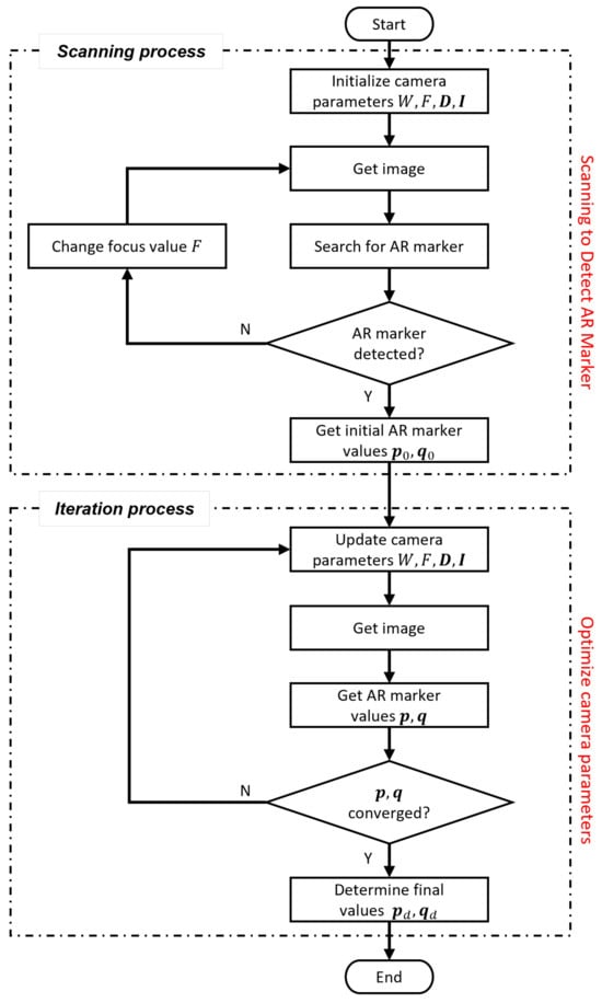 As shown in Figure 6, the proposed camera control system consists of two processes: the Scanning process scans the camera’s shooting range to detect AR markers; the Iteration process optimizes camera parameters based on the detected AR marker positions to determine the final AR marker position and posture. Here, it is assumed that the AR marker is still present within the camera’s shooting range when the camera parameters are changed.