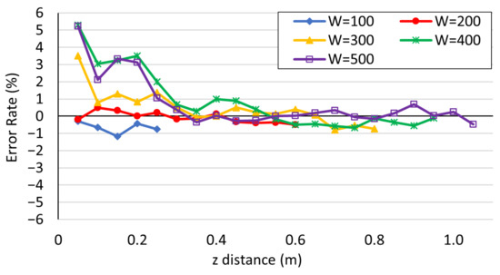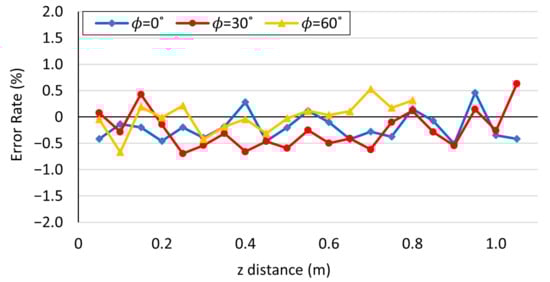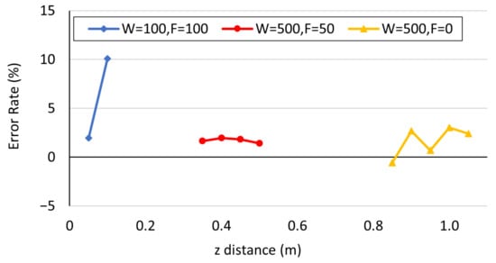 Figure 11 shows the recognition error rate of the marker’s depth distance z. The error rate is within ±1% for the entire range in which AR markers can be recognized. Compared with the recognition accuracy with focus value control (see Figure 10), the proposed method achieved significant performance improvement. Furthermore, the variation in recognition error rates is not biased toward either positive or negative values, indicating that the accuracy of position estimation is high when using this method. The range of recognition distance becomes smaller at , but the recognition accuracy has not deteriorated as long as the marker position can be recognized.