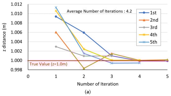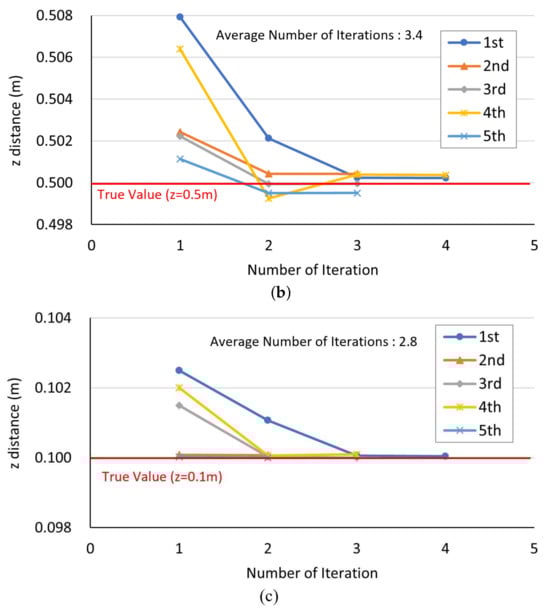 Convergence of the depth distance (z) measurement values to true values by iteration: (a) z = 1.0 m; (b) z = 0.5 m; (c) z = 0.1 m.