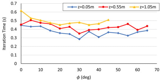 In addition, Figure 15 shows the iteration time required for the convergence of posture recognition in this experiment. According to the result, the iteration time is within 0.6 s, resulting in fast convergence of the recognized value of within the specified iteration accuracy () over the entire recognizable angular range. It can also be seen that the larger the depth distance z, the longer it takes to converge the recognized value of the marker angle .
