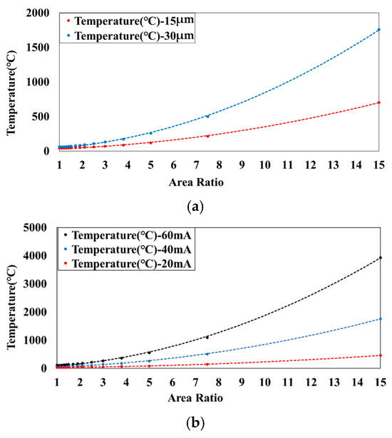 We did not just aim to find the point where the temperature doubles; rather, we sought to determine a practical criterion for the occurrence of defects in interconnects using metal due to thermal stress. By combining the results of multiple papers, we found that reliability could be affected starting from around ~150 °C [24,25,26,27]. Furthermore, by refining the temperature change graph based on the area ratio (Figure 2 and Figure 3), a formula can be obtained. In other words, if we take 150 °C as the reference temperature, doubling the input current would require doubling the via width to prevent any additional temperature increase. Based on the formula, when 40 mA of current flows through a 30 μm wide metal line, resulting in a temperature of 150 °C, the area ratio is approximately three (indicating a via width of 10 μm). If the current is reduced to 20 mA, halving it, we can expect the via to also be halved, allowing for scaling down to 5 μm with an area ratio of ~six, which aligns with the simulation results. Similarly, when 10 mA of current flows through a 15 μm wide metal line, reaching a temperature of 150 °C, and then the current is reduced to 20 mA (halved), we can anticipate the via being halved to 2.5 μm (with an area ratio of ~six), which is also consistent with the graph.