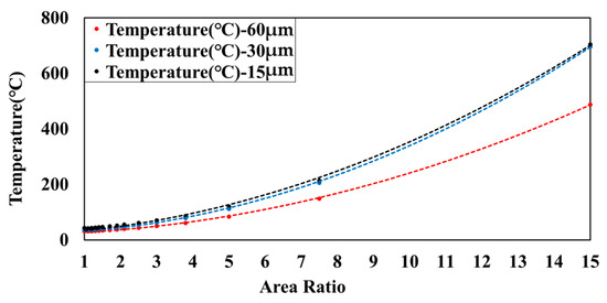 Figure 5 presents the outcomes of the simulations conducted using the structure from Figure 4. Similar to the results of the previous simulations, all the results show a temperature increase based on the area ratio, displaying a second-degree polynomial pattern. Furthermore, there is a consistent trend of the temperature doubling around an area ratio of approximately three, compared to the initial temperature at an area ratio of one, as observed in the earlier simulations.