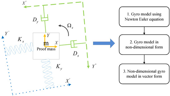 However, all the results mentioned above are based on the assumption that the gyro structure is completely symmetrical; more specifically, the suspending springs and the dampers can perfectly and completely align with the motion axes. In this perfect mechanical gyro structure, the suspending frame coordinates (X′-O-Y′ and X″-O-Y″) can completely overlap with the motion coordinate (X-O-Y), and there is no other force except the Colioris force that can cause the mass to vibrate in the Y-axis. Despite the rapid development of advanced manufacturing technologies, the MEMS gyro structure can never be perfectly symmetrical, and there always exists some angle deviation between the suspending frame coordinate and the motion coordinate. The asymmetrical structure can result in displacement of the proof mass in the Y-axis even if the gyro is not rotating at all. Following the modeling steps depicted in Figure 1, the following Newton–Euler equation can be derived to describe the dynamics of the gyro in the presence of angular deviation between the coordinates [26,27].