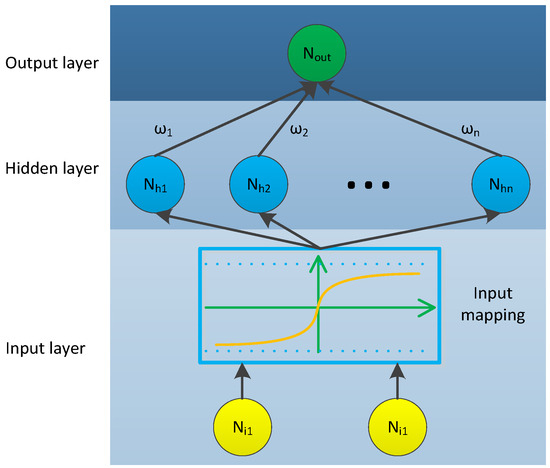 Constrained input mapping layer: Neurons in the input layer can receive input signals for the entire neural network. They will perform a specially designed constrained range transformation on the input signals before passing them to the next layer. The purpose of the input mapping layer is to map the input signals into an appropriate range. Here, the gyro tracking error is chosen as the original input signal, and a sigmoid function with variable ranges is adopted as the constrained input mapping function. The converted input signal is calculated as
