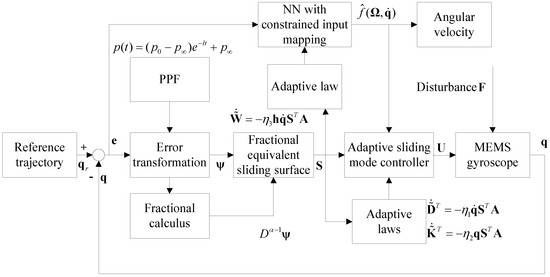 As one kind of robust control scheme, sliding mode control (SMC) is superior in its control performance in dealing with external disturbances as well as parameter uncertainties. At the same time, the MEMS gyro, as one kind of complex and precise measurement device, can be easily affected by external and internal disturbances. As a result, it is natural and feasible to use SMC in the control of the gyro’s dynamics, and relevant approaches have been developed. In [11], a harmonic disturbance observer is integrated into the SMC for gyro control, in which the frequency information is used to achieve high tracking accuracy. A compound control method for gyro control integrating PD control and terminal SMC is introduced in [12], achieving finite time tracking error convergence as well as strong robustness. However, the traditional SMC methods mentioned above cannot avoid chattering in control forces, and the high-frequency chattering can cause damage to actuators in gyros. To make up for this drawback, investigations such as high-order sliding mode control [13], the super twisting algorithm [14], and so on have been vastly and deeply investigated for chattering reduction.