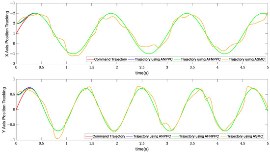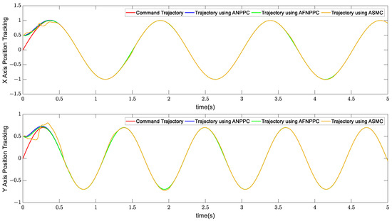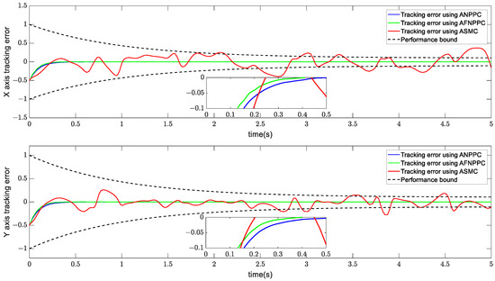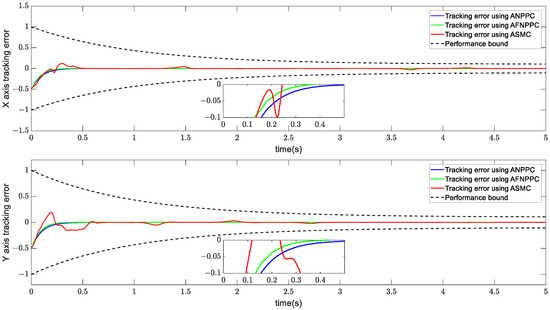 To further illustrate the superior control performance of the proposed method, simulation results on a gyro system under a time-varying angular rate and uncertain damper and spring coefficients are provided in Figure 6 and Figure 7. Trajectory tracking curves of the three control methods shown in Figure 6 imply that although all three methods can still drive the gyro into a driven mode, the control performance of ASMC is not so good when compared to the other two performances using ANPPC and AFNPPC. Figure 7, in support of the results derived from Figure 6, shows the error dynamics of the three control methods. It can be found from Figure 7 that the control error of ASMC can go beyond the error performance bounds, while the tracking errors using ANPPC and AFNPPC can always stay within the performance bound. The results suggest that the ANPPC and AFNPPC can maintain excellent gyro trajectory tracking performance and attain safe gyro operation in the presence of time-varying angular velocity, while traditional ASMC cannot achieve such a satisfactory control performance. It shall be emphasized again that a more precise control performance can be achieved by incorporating the fractional order calculus in the controller design, since a faster AFNPPC error convergence can be observed than that of ANPPC.