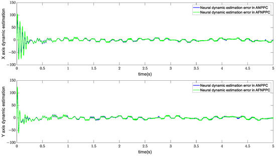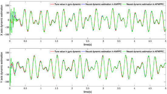 Figure 8 and Figure 9 provide neural estimation performances for gyro angular velocity-related dynamics. In Figure 8, the red curve is the true value of gyro dynamics, and the blue curve and the green curve depict the estimation performances of neural networks in ANPPC and AFNPPC. It can be easily found from Figure 8 that both neural networks can estimate gyro unknown and time-varying dynamics quickly and accurately. It can also be observed from the neural estimation error performance depicted in Figure 9 that the estimation error can remain within a small error boundary, indicating that the proposed neural network can maintain a good estimation performance even with randomly initialized parameters. One can further obtain the conclusion that the proposed constrained input mapping can indeed provide guidance for the neural network parameter initialization and thus can improve the neural estimation performance.
