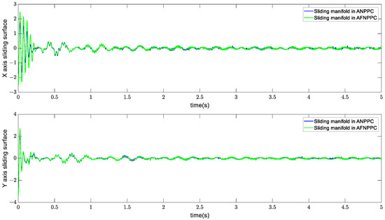 Sliding manifolds and control forces of ANPPC and AFNPPC in the X and Y axes are presented in Figure 10 and Figure 11. It can be found from Figure 10 that the sliding manifolds in both the X and Y axes can converge to 0, indicating that gyro error dynamics can be attracted to slide on the designed sliding manifold. Figure 11 shows the control forces of ANPPC and AFNPPC, and the control forces are quite smooth without severe chattering problems.