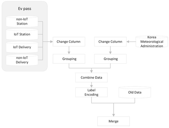 The micro-mobility data described in Table 3 and the weather data in Table 4 are preprocessed and combined to form the total data. Figure 2 shows the data preprocessing process. First, the mobility data and weather data are grouped by date. During the encoding process, weekdays and weekends were encoded as 0 and 1, respectively. In Figure 2, old data refers to data up to the previous day. The data used in this study was updated daily. We preprocessed only the new data that came in that day and added it to the old data to update the entire dataset. The precipitation data has a minimum value of 0 and a maximum value of 174, and we categorized it into seven levels from 0 to 6. The precipitation was categorized as follows: no precipitation was level 0; 1 mm of precipitation was level 1; 1 to 5 mm of precipitation was level 2; 5 to 10 mm of precipitation was level 3; 10 to 15 mm of precipitation was level 4; 15 to 20 mm of precipitation was level 5; and more than 20 mm of precipitation was level 6. The two datasets were then combined to form one complete dataset. Through preprocessing, we processed the data from 16 April 2019 to 11 August 2022, which includes a total of 1141 data instances with ten columns. The result is the experimental dataset shown in Table 5.