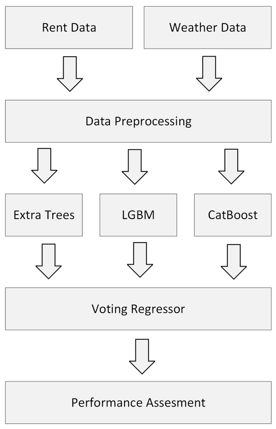 In this study, we compared the performance of various models using the PyCaret library and selected the top three models, Extra Trees [35], LightGBM [36], and CatBoost [37], based on the performance evaluation scores of MAE, MSE, RMSE, RMSLE, and mean absolute percentage error (MAPE). These three models were used to construct the voting regressor [38] model.