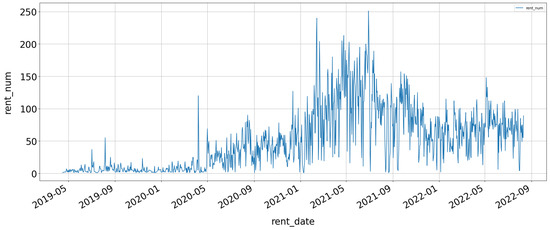 The data were composed of 1141 instances and 10 columns (full date, year, month, days, number of rentals, temperature, precipitation, humidity, insolation, and weekends). Figure 4 shows the number of rentals from April 2019 to August 2022 for the entire data period. The number of rows was 1141, the average was 52 to 53, the minimum value was 1, and the maximum value was 251. The x-axis represents the date and the y-axis represents the number of rentals.