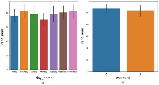 Figure 6 shows the average number of rentals per day of the week. According to Figure 6A, the number of rentals was highest on Thursdays out of the weekdays and Saturdays in the weekend. Figure 6B shows the average number of rentals depending on weekends, represented by 1, and weekdays, represented by 0. It can be seen that the average number of rentals is slightly higher on weekdays.