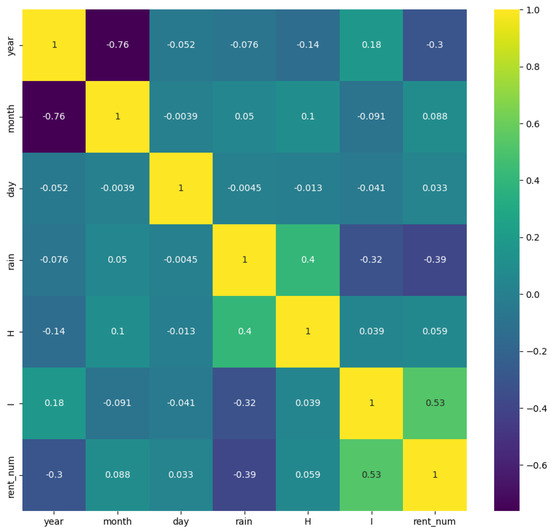 Figure 7 is a heatmap of the correlation between all variables over the entire period. Here, we can see the correlation between the number of micro-mobility rentals and the nabber variable. It can be observed that solar insolation, precipitation, and temperature have a great influence on the number of micro-mobility rentals. Table 6 lists the top four features with the highest correlation separately for summer and winter. Analyzing the characteristics affecting the number of rentals by season shows that the important factors affecting the number of rentals are different in summer and winter.