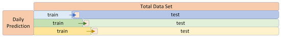 Figure 8 illustrates the daily training method. For example, data from 16 April 2019 to 10 August 2022 were used as the testing set to forecast the rental counts for 11 August 2022. The input data for the prediction include the rental date (year, month, day), weekend indicator, temperature, rainfall, insolation, and humidity.