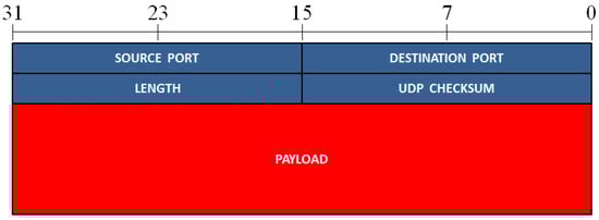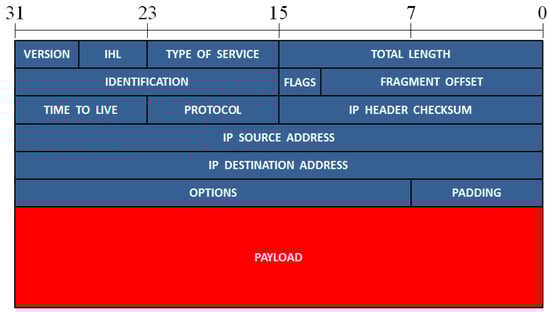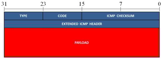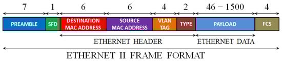 Ethernet is a widely used networking technology that finds its application in local area networks (LANs), metropolitan area networks (MANs), wide area networks (WANs), and other fields, such as industry, avionics, telecommunication, and multimedia. The Ethernet technology was introduced in 1980, and the first standardization was conducted in 1983 by IEEE 802.3 [34]. The data transfer rate of Ethernet has evolved from the initial 2.94 Mbps up to 100 Gbps [35]. In Ethernet networking, the data are described according to different levels of abstraction in the OSI model [36]. At level 2 (data link layer) of the OSI model, the data are described in the form of frames. The format of an Ethernet II frame is displayed in Figure 1. It always starts with a preamble and a start frame delimiter (SFD), and it ends with a frame checksum (FCS), a four-byte CRC that detects any corrupted data in the frame. The header of the Ethernet frame consists of the following fields: a destination and source media access control (MAC) address, a VLAN tag (an optional field), and the protocol type of level 3 (network layer), while the payload represents the data of the network layer. The packet formats of two of the most important protocols of the network layer, ARP, and IP, are presented in Figure 2 and Figure 3, respectively. The IP header also includes the protocol of the level 4 layer (transport layer), whose data are present in the IP payload. Three different protocols of the transport layer were considered, namely TCP, UDP, and ICMP, and their packet formats are presented in Figure 4, Figure 5 and Figure 6, respectively.