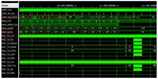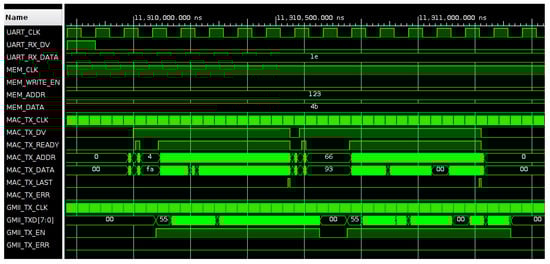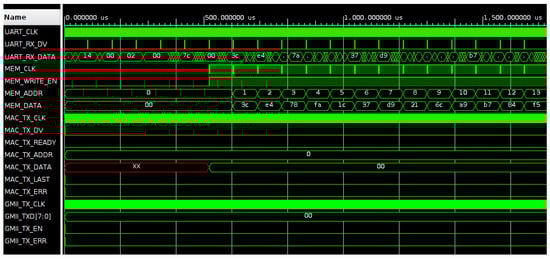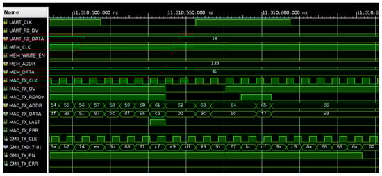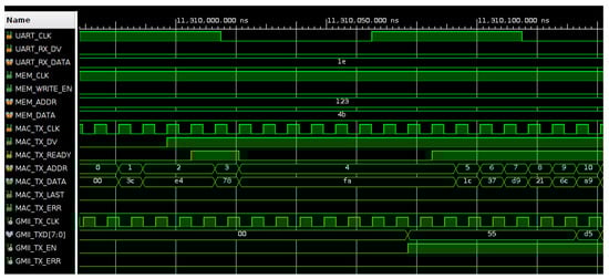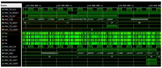 Figure 10 shows the waveform signals in the case of a single write operation, where the two Ethernet frames in the dataset are read from memory via the MAC-TX_CONTROL module. Then, the data are sent to the input of the TEMAC module, which generates the output data for the Ethernet PHY chip on the KC705 board. Figure 11 and Figure 12 illustrate the signal waveforms of the first frame’s transmission. The valid data signal (MAC_TX_DV) was enabled during the transmit operation, and data read from memory were sampled when the MAC_RX_READY signal was active. Initially, the frame length in bytes was read from memory (0x003c, 60 bytes); then, the MAC_TX_DV signal was enabled, and the frame data were transmitted. During the transmission of the last byte of the frame, the MAC_TX_LAST signal was enabled; then, the MAC_TX_DV signal was disabled, and, after a delay, the second frame was transmitted. At the output of the TEMAC module, the frame data (GMII_TXD) were sent to the Ethernet PHY chip preceded by the frame preamble (0x55555555555555d5) and followed by the frame checksum (0x8a68866a). During transmission, the GMII_TX_EN signal was enabled.