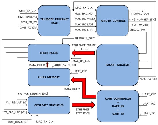 After frame analysis and the pulsed FIREWALL_OUT signal, the CHECK_RULES module assesses if the packet matches the firewall rules. These rules are defined based on IP packet characteristics, such as source and destination address ranges, layer 4 protocol, and source/destination port ranges, are stored in the RULES_MEMORY module, and loaded from a PC via UART. The CHECK_RULES module outputs packet type (FW_PCK_TYPE), packet length (FW_PCK_LENGTH), and analysis results (FW_RESULT—zero for packet errors, one for rule violations, and three for allowed packets).