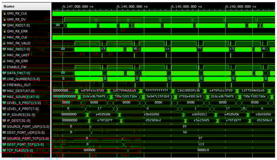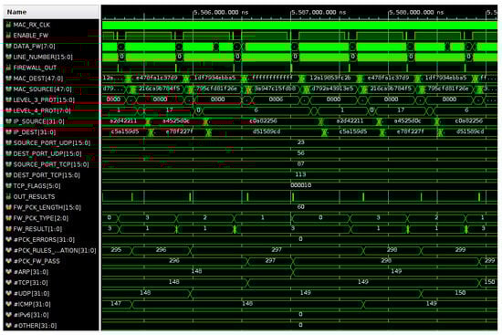As shown in Figure 15, among the four generated packet types (UDP, TCP, ARP, and ICMP), TCP (FW_PCK_TYPE = 1) and ARP (FW_PCK_TYPE = 0) are classified as ‘allowed’ (FW_RESULT = 3). Specifically, TCP packets were allowed, as their IP source addresses comply with the firewall rules, and ARP packets were allowed as they are not IP packets (LEV_3_PROT = 0x0806).