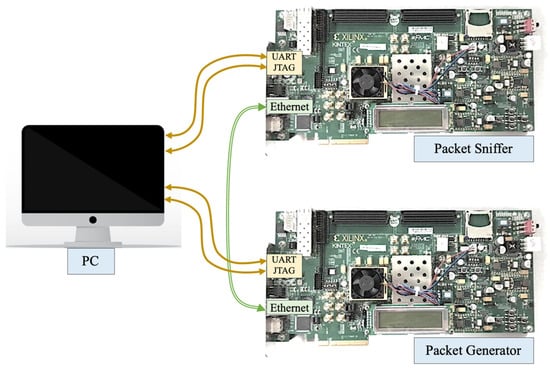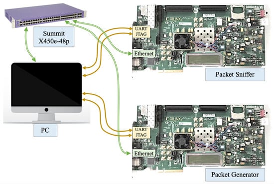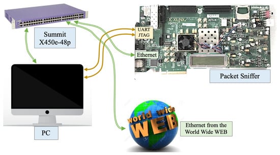 After successfully testing the designed packet sniffer with controlled Ethernet traffic generated via the packet generator, the system was further evaluated with real-world Ethernet traffic. This real-world test was conducted using the experimental setup depicted in Figure 21.