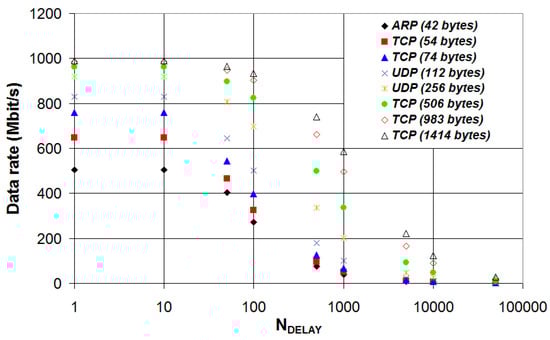 From Equation (3), it is evident that, even for NDELAY = 0, the data rate cannot reach the maximum value of 1 Gbit/s. However, it can be asymptotically approached as NETH → +∞. We conducted tests using the packet generator in continuous mode, assessing various Ethernet frames with different byte lengths and protocols: ARP (42 bytes), TCP (54 bytes), TCP (74 bytes), UDP (112 bytes), UDP (256 bytes), TCP (506 bytes), TCP (983 bytes), and TCP (1414 bytes). Each Ethernet frame was subjected to different inter-frame delays, including 0, 10, 50, 100, 500, 1000, 5000, 10,000, and 50,000 clock cycles. The results of these tests are presented in Figure 17.