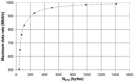 In Figure 18, the maximum data rate is plotted vs the frame length in bytes (NETH). These measured data have been fitted to Equation (4), and this resulted in a high correlation (R2 > 0.98) and an estimated value of NMAC of about 16 clock cycles.