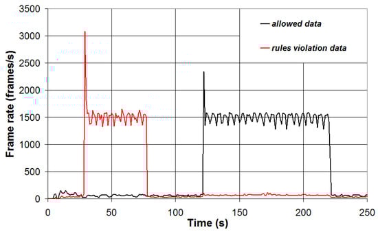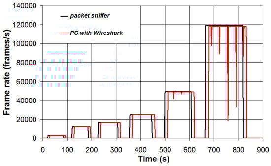 Next, we evaluated and compared the performance of our proposed packet sniffer against a PC running Wireshark. Figure 19 illustrates the experimental setup, which involved the use of an Extreme Networks Summit X450e-48p switch (Extreme Networks) to provide identical Ethernet traffic to both the packet sniffer and the PC running Wireshark. The PC’s Ethernet port was linked to switch port two, while the traffic from port two was mirrored to port ten, where the Ethernet port of the packet sniffer was connected. To accommodate this experimental setup, we implemented the optional virtual local area network (VLAN) field in the Ethernet frame within the packet sniffer. This adjustment was necessary, as the traffic mirrored to port ten carried the VLAN tag. The packet generator was linked to port six of the switch, responsible for generating Ethernet frames addressed to the PC. These Ethernet frames were continually transmitted, with varying inter-frame delay values. The results of this test are illustrated in Figure 20, depicting frame rates over time for both the packet sniffer and the PC running Wireshark. The plotted data were found to align, as expected, but there was a notable delay of approximately 8–11 s in the PC running Wireshark’s response compared to the packet sniffer. Furthermore, when the frame rates exceeded 48,000 frames per second, the PC running Wireshark began losing data and eventually crashed at frame rates exceeding 100,000 frames per second. This demonstrates the packet sniffer’s ability to accurately monitor Ethernet traffic with data rates of up to 1 Gbit/s, while a PC running Wireshark encounters issues when data rates are too high.