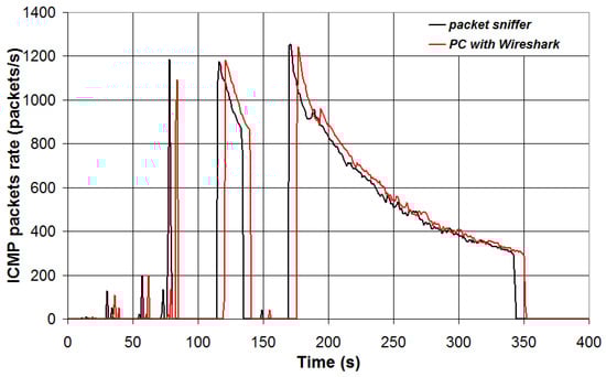 ICMP packets rate under different ICMP flood attacks detected with the packet sniffer and the PC running Wireshark.