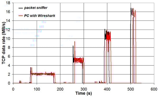 TCP data rate, in MB/s, in the case of file download using the Linux command “wget” for the packet sniffer and the PC running Wireshark.