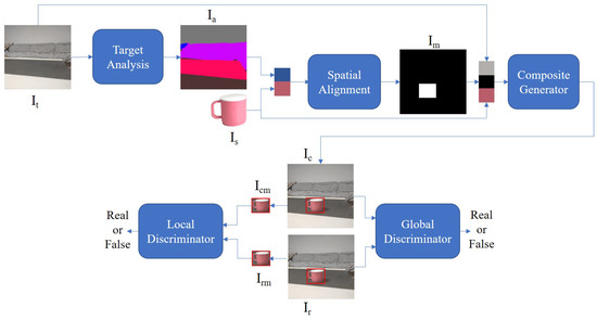 Although the reasonable placement of the source object has been determined, the resulting composite image may still be unrealistic. The reason for this is that the source object and target images are collected under different lighting conditions and shooting angles. Therefore, the source object should be further processed to make it consistent with the color of the target image. We use a generative network for image compositing. The generator takes the input data as a condition to generate a brand new image. The output of the generator tends to be plausible as long as the input of the discriminator is a real image. One original task of an adversarial generative network is generating real face images based on random noise [28], which is almost independent of the initial input data. So, the generated source objects are more easily integrated with the target image in terms of shape and color.
