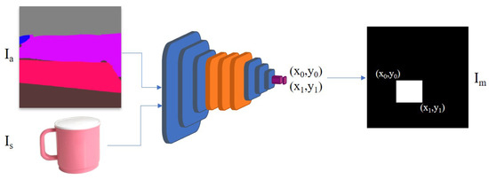 After the semantic analysis of the target image, the analyzed data () and the source object () are fed to the spatial alignment network to predict the location and size. Based on the input information, the spatial alignment network predicts the mask map of the source object, which corresponds to the position and scale distribution of the source object in the target image to be embedded. The mask map is set to a rectangle, and the network gives two coordinates of the diagonal of the rectangle: the coordinates in the upper left corner and the lower right corner.