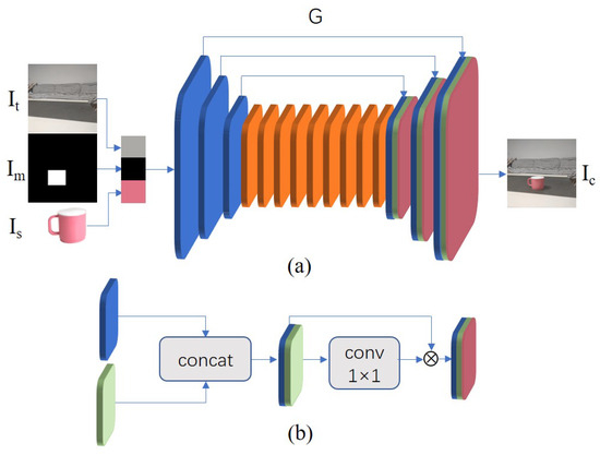 We use the merge data, source object , mask map , and target image as the input of the composite generator. Where is 256 × 256 × 4, mask map is 256 × 256 × 1, and is 256 × 256 × 3. So, the input data are 256 × 256 × 8.