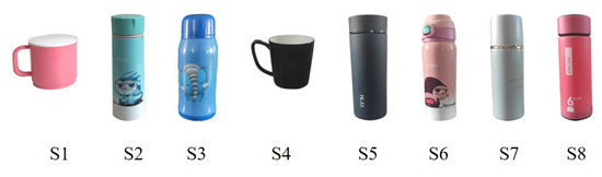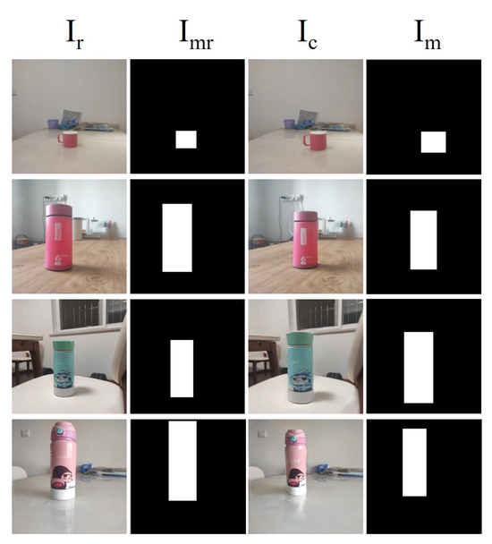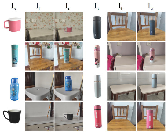 The SHU dataset is proposed by MT-GAN and contains a total of 7756 images across eight source object categories, including 6206 images in the training set and 1550 for the test. The source objects are different in color, texture, and pattern. The data are taken in different scenes with diverse angles, distances, and lighting conditions. The paired samples are a target image without the source object and a ground truth image with the source object under the same photographic conditions. Each ground truth sample also marks the RoI containing the source object and corresponding shadows. In this paper, the spatial alignment network inputs the source object region, excluding the shadow part. Thus, we add a bounding box annotation containing only the source objects. The spatial alignment network and the composite generator are trained and tested on the SHU dataset, of which 20% is used for the test set and 80% for training. Further, we add new test data to test the generalization of the network, called the generalization test set (GTS), to distinguish them from the previous test set (PTS). The images in the PTS exhibit different angles and different lighting conditions compared to the training data, but the same scene. To test the compositing effect of our method in multiple brand-new scenarios, we collect a total of 400 images from 15 completely different scenes in the GTS, using different angles and distances to those used with the PTS. Considering that the GTS needs to be adapted for image composition with source objects, we adopt a similar shooting method with the SHU dataset. The difference between the SHU dataset and other datasets is that there are multiple paired images corresponding to a source object. Each pair of data contains a target image (without the source object) and a ground truth image (with the source object) under the same shooting condition. To our knowledge, there are currently no other datasets with large quantities of paired sample data in different scenes. In addition, we name the eight categories of source objects, which are shown in Figure 6.