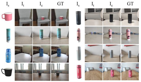 Figure 9 shows that the source objects have been resized and placed on the matching target objects, making the composite images appear reasonable. In addition, the network adjusts the angle of the source objects. Taking the composite image of source object s1 as an example, the white lid of the cup has an inclination angle. This indicates that the source object in the composite image has an angle adjustment in the Z-axis direction relative to the original source object.