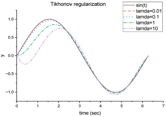 To illustrate this concept, let us demonstrate the prediction of a sine function using the Tikhonov regularization method. First, we generated data for the sine function and defined a Tikhonov regularization function. This function utilized matrix operations to compute the regression parameters, denoted as w. Subsequently, we set the regularization term and constructed a design matrix X of size n. Utilizing Equation (2), we calculated the minimum Loss to use the Tikhonov regularization function for prediction and stored the results in y_pred. Finally, we plotted the original sine function and the predicted results of Tikhonov regularization as the blue and red curves, respectively (refer to Figure 1). Tikhonov regularization has been proven to be a valuable technique in control systems, offering stability and reliable solutions for problems with unstable or nonexistent solutions.