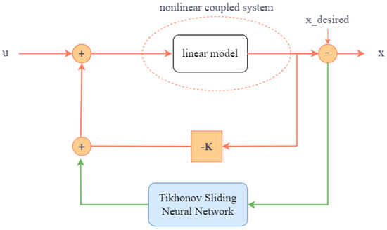 However, in practice, the and are always unknown, making the design of Equation (12) challenging. Many recent studies have attempted to address this problem, but they encounter issues with complex manipulations and inadequate performance. In this paper, we propose a simple approach to designing the controller. We utilize a Tikhonov-tuned sliding mode neural network (TSN) controller to handle model-free problems, ensuring that the states closely approach the desired region. Simultaneously, a sliding mode controller is employed to maintain the system’s states on the sliding surface, eventually allowing to approximate , leading to improved performance and making sure that the states are converged. The designed controller is as follows: