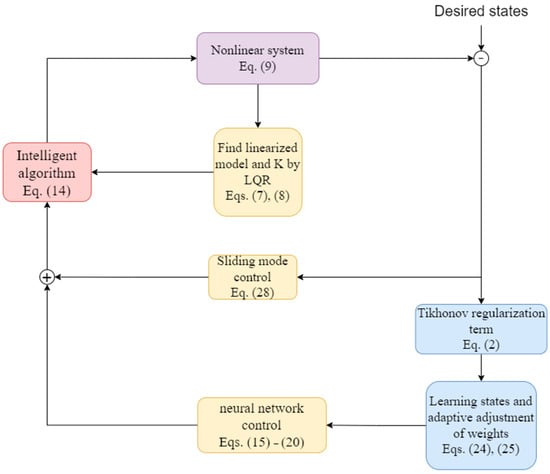 Therefore, this paper proposes the design method of the Tikhonov sliding neural network (TSN) controller, as shown in Figure 2, which combines Tikhonov regularization with a neural network to achieve intelligent control of the inverted pendulum. In this section, a step-by-step explanation is provided of how to combine and compute Tikhonov regularization, neural networks, and sliding mode control. The process starts by setting the goal of achieving intelligent control for nonlinear systems through the application of Tikhonov regularization within the framework of sliding mode control. A sliding mode controller is then established to control the system by sliding its state onto a specific sliding surface to achieve the desired control effect. Neural networks are introduced as a crucial component to monitor and adjust the regularization terms in Tikhonov regularization, utilizing their learning and adaptive adjustment capabilities. Finally, the combination of Tikhonov regularization, neural network, and sliding mode control is realized through iterative computation and application of the controller, which involves integrating the system’s inputs and outputs with the controller and adjusting the regularization terms and neural network weights based on the specific circumstances.