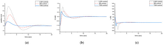 Subsequently, the values of couldbe determined as = [−258.12 −170.35]; then, the eigenvalue of was [−1.0632 −34.7103]. As shown in Figure 2, the control system employed a sliding neural network to handle the nonlinear coupling characteristics and dynamically adjust the weights of the TNN to ensure both stability and predictability. After comparing the LQR, sliding neuralnetwork (SN), and Tikhonovsliding neural network (TSN) methods, as depicted in Figure 3, under the condition of requiring both the position and the angle to be zero, it becameevident that the TSN method excelled in decoupling. The weight factor values, presented in matrix format, were derived from the aforementioned sections. These values were stored in a matrix, where each row represented a distinct factor or variable, and each column corresponded to the relevant weight factor value. The optimal regularization term was set to 0.1, and initial weightings were all set to 0.15. According to Equation (28), the matrics of , , and .